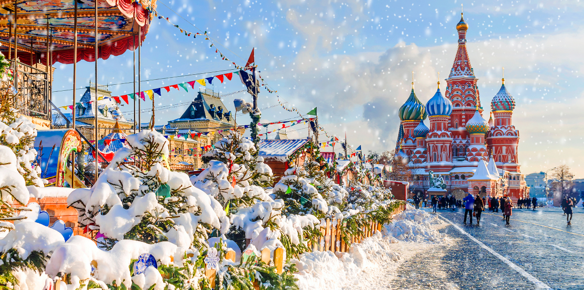 12:00 - Прогулка по Красной площади, где располагаются знаменитый каток, веселые карусели и красочная новогодняя ярмарка. Внешний осмотр Собора Василия Блаженного, ГУМа и Московского Кремля.
